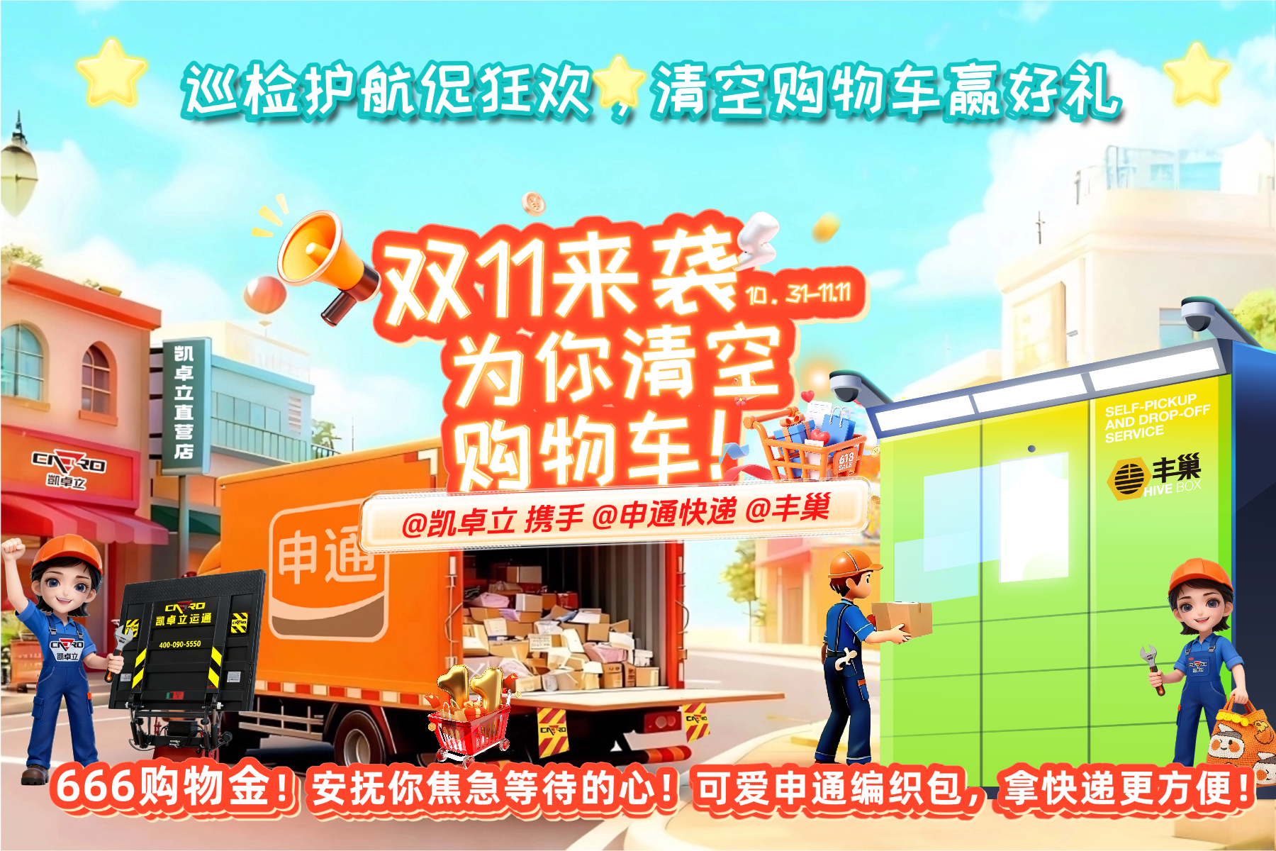 清空購物車迎好禮!凱卓立 × 申通 × 豐巢雙十一巡檢護航,促狂歡。 親愛的 “剁手黨” 們,雙十一的快遞是不是已經讓你忍不住刷了八百遍物流信息?別慌!為了讓你順順利利拿到每一個包裹,凱卓立攜手申通快遞、豐巢,開啟雙十一巡檢護航促狂歡活動,從物流運輸到末端交付,全程為你的包裹 “保駕護航”!